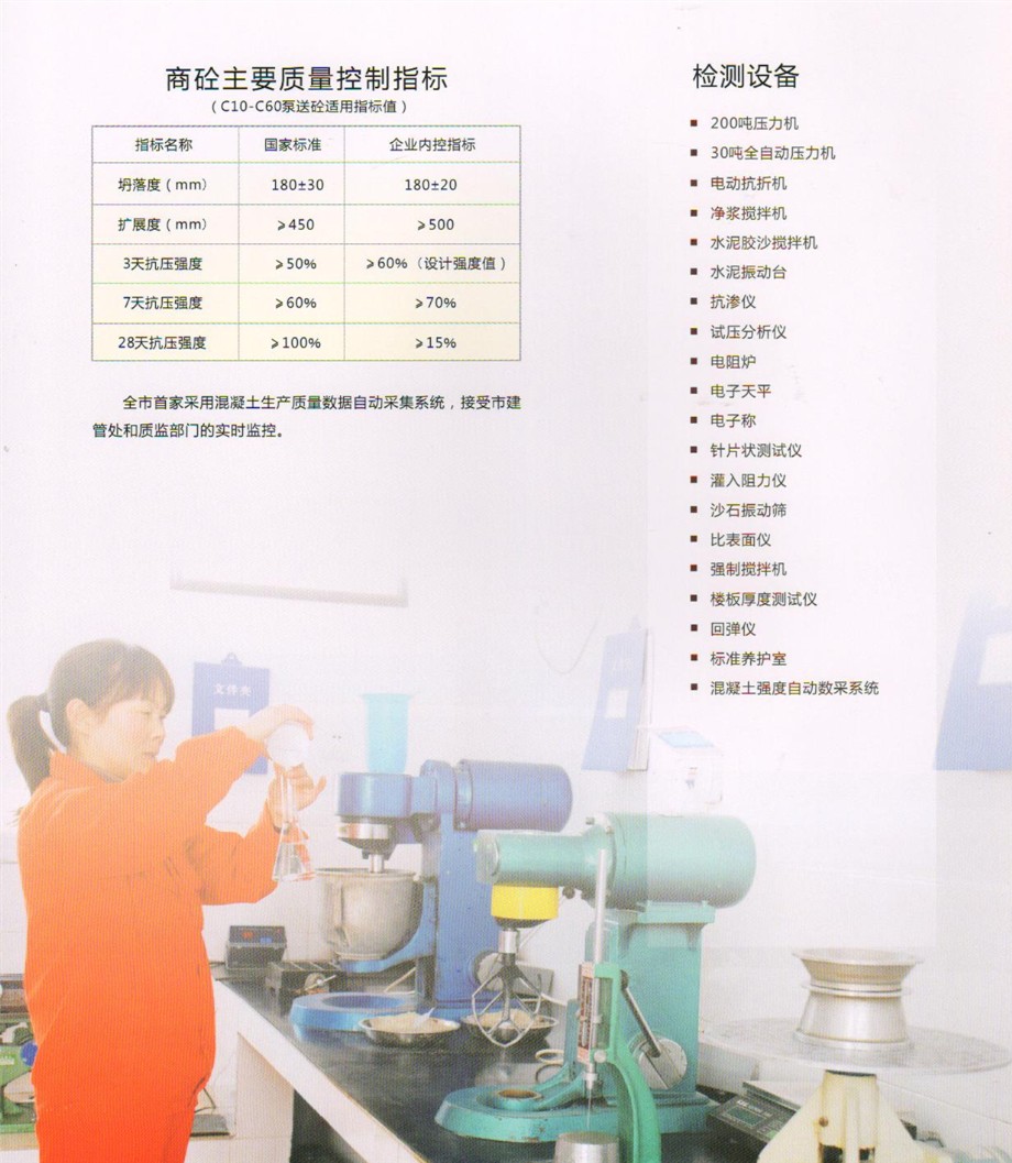 公司設有先進的實驗室,配備全套混凝土及原材料檢測試驗設備,配有專職的試驗、檢驗人員,可承擔混凝土的材料性能試驗,工藝質量控制、產品質量檢驗等全部試驗、檢驗項目,為確保混凝土質量提供了可靠的保證。